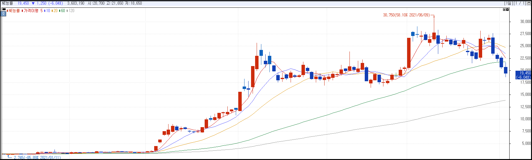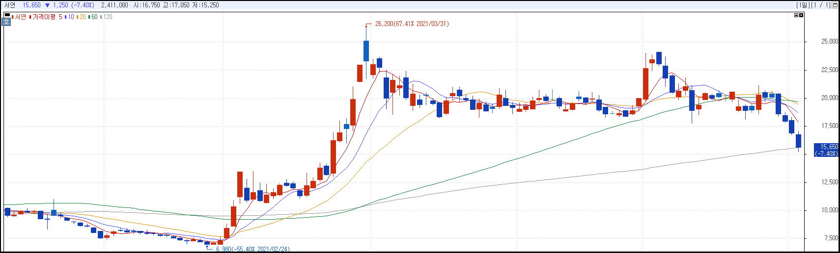 서연도 최저 6,980원에서 최고 26,200원까지 급등을 하였지만 윤석열 전 검찰 총장이 대권 출마 선언을 한 날부터 연일 하락을 보이고 있습니다. 서연 또한 아직 대선 직전까지는 계속 관망을 해야 할 종목입니다.