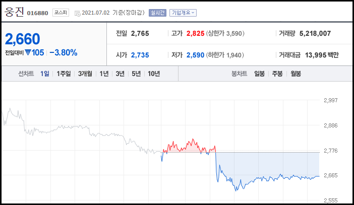 웅진은 최저 1,000원에서 최고 4,165원 까지 4배가량 상승을 하였으나 윤석열 전 검찰총장의 대권 출마 선언 때부터 연일 하락을 하고 있는 모습입니다.
