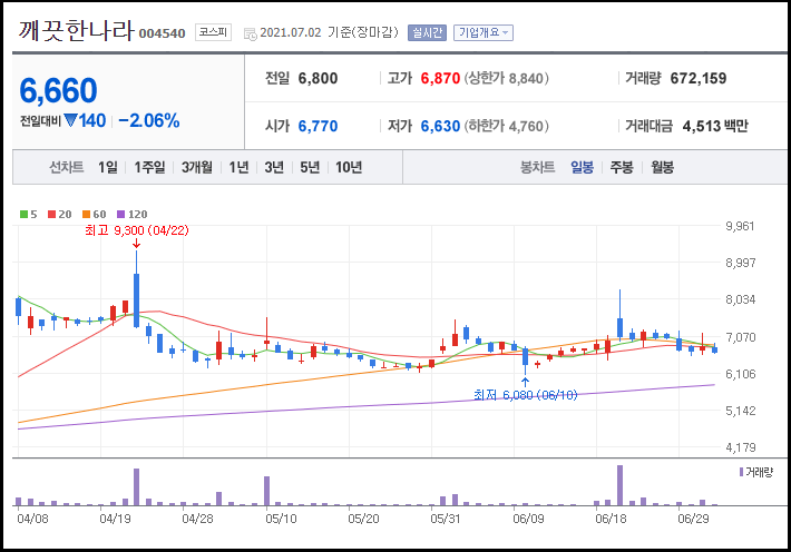 그래서 윤석열 전 검찰총장이 대권에 도전할 것이라는 뜻을 내비치는 순간부터 깨끗한 나라는 최저 3,700원에서 최고 9,300원까지 급등하였습니다.