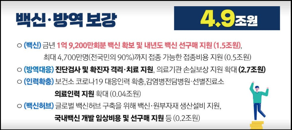 또한 소상공인을 대상으로 하는 희망회복자금 지원금도 최대 2천만 원 지급되며, 백신·방역 보강 및 고용, 민생안정지원 등 총 34조 9천억 원 규모의 추경안을 의결했습니다.