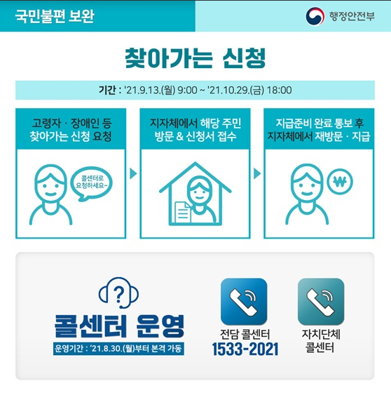 고령자나 장애인 분들은 찾아가는 신청을 하실 수 있습니다. 콜센터가 운영되며 전화번호는 ☎ 1533-2021번이며 콜센터로 요청을 하시면 주소지 주민센터에서 집으로 방문하여 신청서 접수를 받아 다시 지급 준비가 완료되면 다시 방문하여 선불카드나 지역사랑 상품권으로 지원금을 지급하게 됩니다.