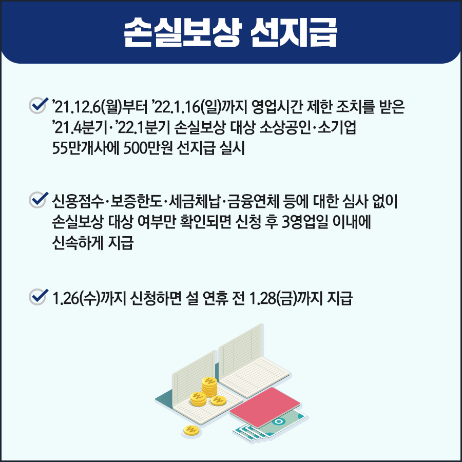 손실보상 선지급은 손실보상금이 긴급히 필요한 소상공인에게 적시에 전달될 수 있도록 일정 금액을 우선 지급하고 추후 확정되는 손실보상금으로 차감하는 새로운 손실보상 방식입니다.
