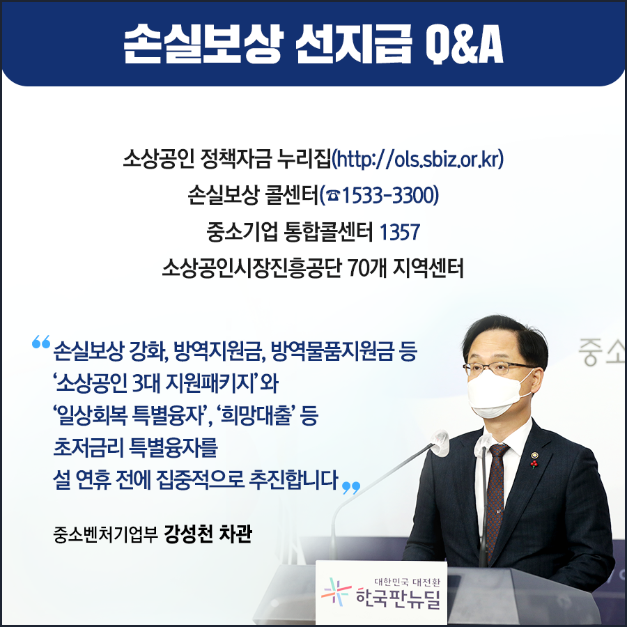 한편, ’ 21.12.16 거리두기를 강화하면서 발표한 손실보상 강화, 방역지원금, 방역물품 지원금 등 ‘소상공인 3대 지원 패키지’와 ‘일상 회복 특별융자’, ‘희망대출’ 등 초저금리 특별융자를 설 연휴 전에 집중적으로 추진합니다.