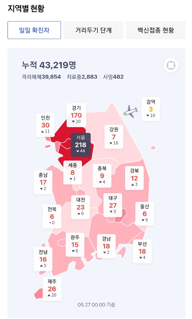 5월 27일 코로나 바이러스 전국 감염자 수
