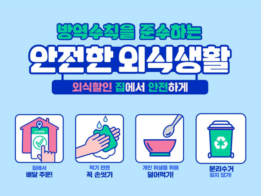 정부에서는 외식사업이 위축되고 코로나 19로 감소된 외식사업의 매출을 보전하기 위하여 포장. 배달 영업을 도입하는 많은 음식점을 지원하고 국민들의 생활 속 방역 수칙 준수를 유도하는 측면에서 비대면 외식 지원 행사를 하였습니다.