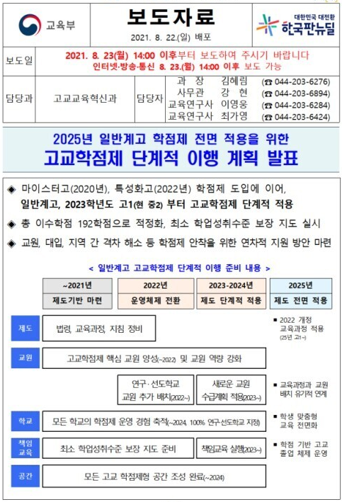 안녕하세요. 현재 고등학생들 그리고 앞으로 고등학생될 학생들과 고등학생 부모님들이 꼭 알아두어야할 부문이 있습니다. 지난 8월 23일 교육부가 고교학점제에 대한 발표를 하였습니다. 2025년 전면 적용을 위한 고교학점제 단계적 이행 계획이 발표가 있었습니다.