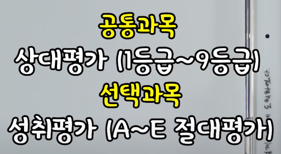 지금처럼 내신 9등급 제도로 성적을 채점하면 수업을 듣는 학생이 적어질수록 좋은 성적은 받을 수 어렵게 됩니다. 그래서 모든 학생들이 들어야 하는 공통과목은 기존대로 성적을 9등급으로 나누고 선택과목은 성취평가제로 성적을 채점하게 됩니다.