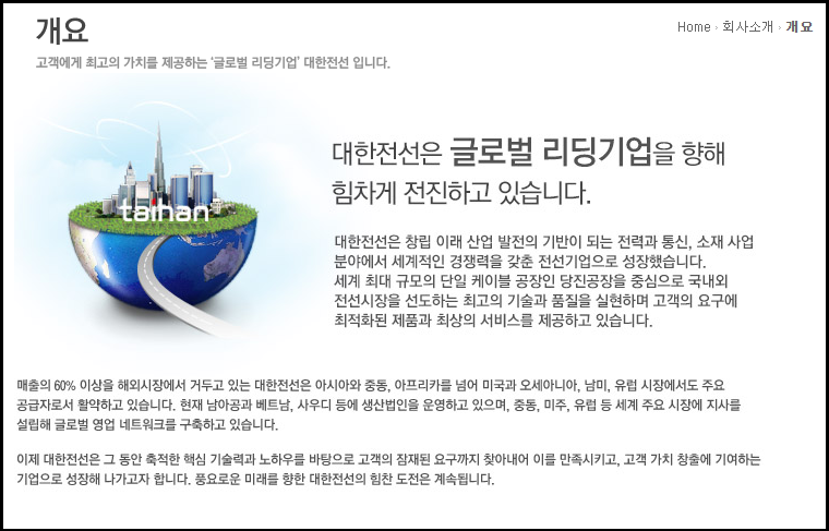 대한전선은 국내 최초 종합 전선회사인 대한전선 주식회사로 설립되었으며 동사 포함 총 9개의 계열회사를 가지고 있습니다. 동사의 주요 사업은 전선부문과 기타 부문으로 구분되며, 주요 제품으로는 초고압 케이블, 통신케이블, Copper Rod 등이 있고, 60여 년 동안 우수한 신뢰도와 제품력이 가장 큰 강점이며, 특히 현존하는 최고 등급인 500kV 지중 초고압 케이블의 생산 및 운영능력에 대해 세계적으로 인정받고 있습니다.