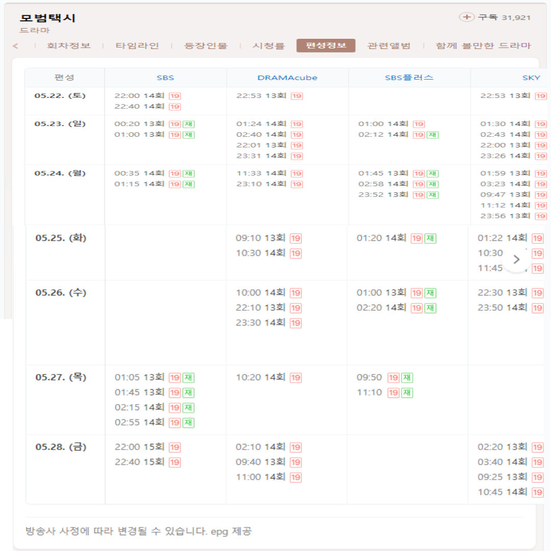 편성 : SBS 2021.04.09. ~ (금, 토) 오후 10:00