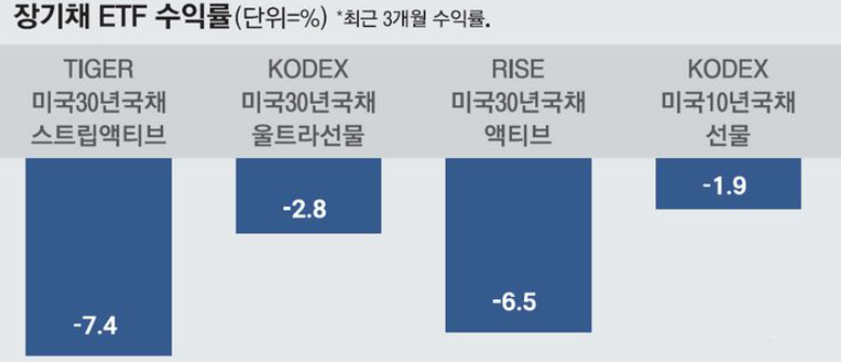 ‘TIGER미국 30년 국채스트립액티브’는 최근 3개월간 7.4% 하락했고, ‘RISE미국 30년 국채액티브’는 6.5%, ‘KODEX미국 10년 국채선물’도 1.9% 하락했습니다.