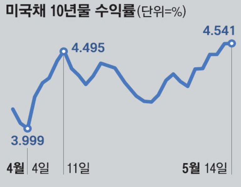 지난달 10년물 미국 국채 수익률이 4.495%를 기록했던 고점을 넘어 4.541%까지 상승했습니다.
