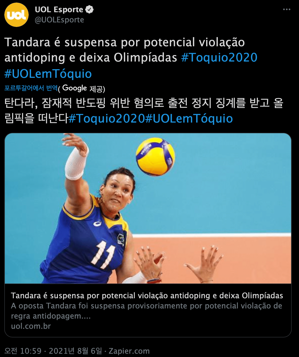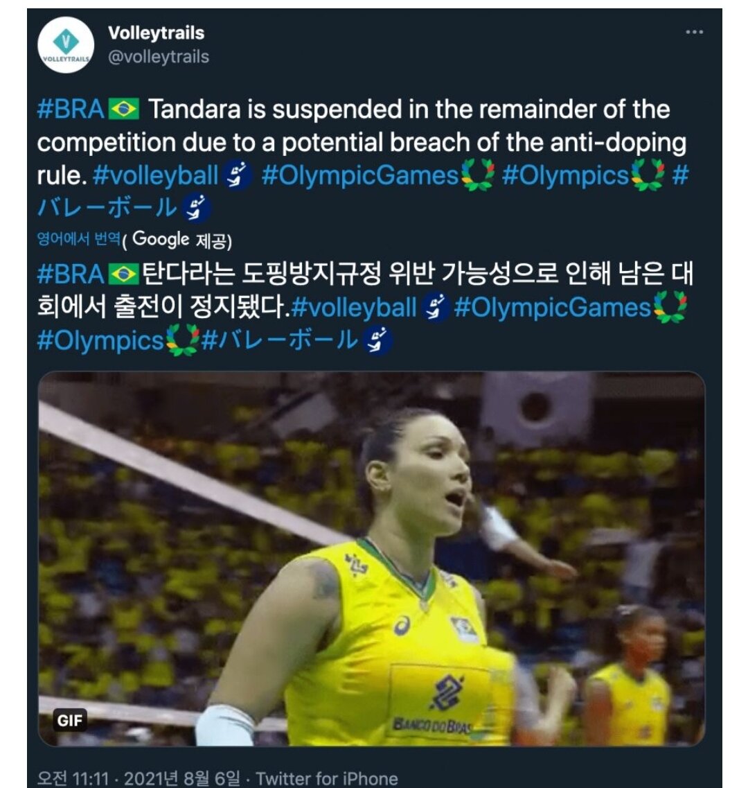 브라질은 올림픽 출전하기 7월에 국가대표 선수 전원에 대하여 도핑 테스트를 실시하였고 그 결과가 오늘 6일에 발표되었습니다. 도핑테스트에 적발된 브라질 여자배구 선수는 여자배구 주전 선수 '탄다라 카이 세타'라고 하며 나이는 33세입니다.