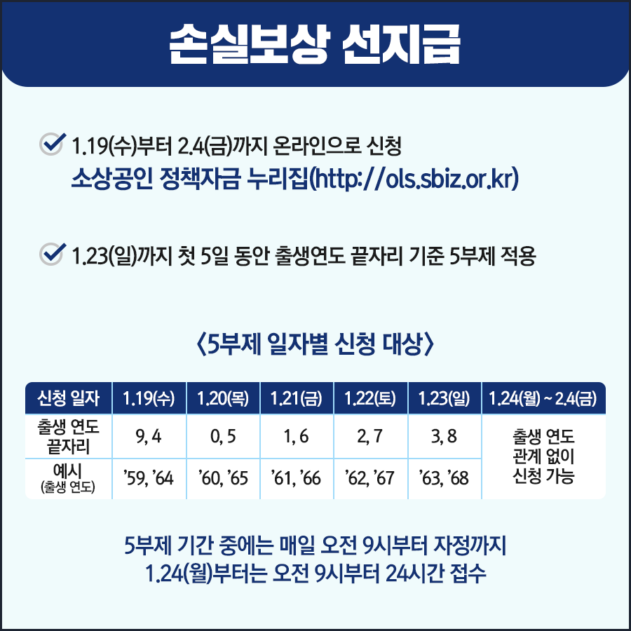 손실보상 선지급 신청 및 접수는 1.19(수) 오전 9시부터 2.4(금) 24시까지 주말·공휴일 관계없이 소상공인 정책자금 누리집에서 온라인을 통해 진행됩니다.