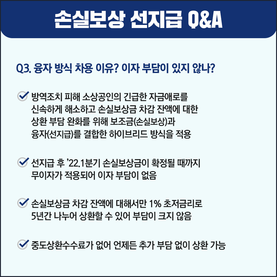 선지급금에 대해서는 손실보상금이 확정되기 전까지는 무이자가 적용되고, 손실보상금으로 차감하고 남은 잔액에 대해서는 소상공인의 부담을 최소화하기 위해 1% 초저금리가 적용됩니다.