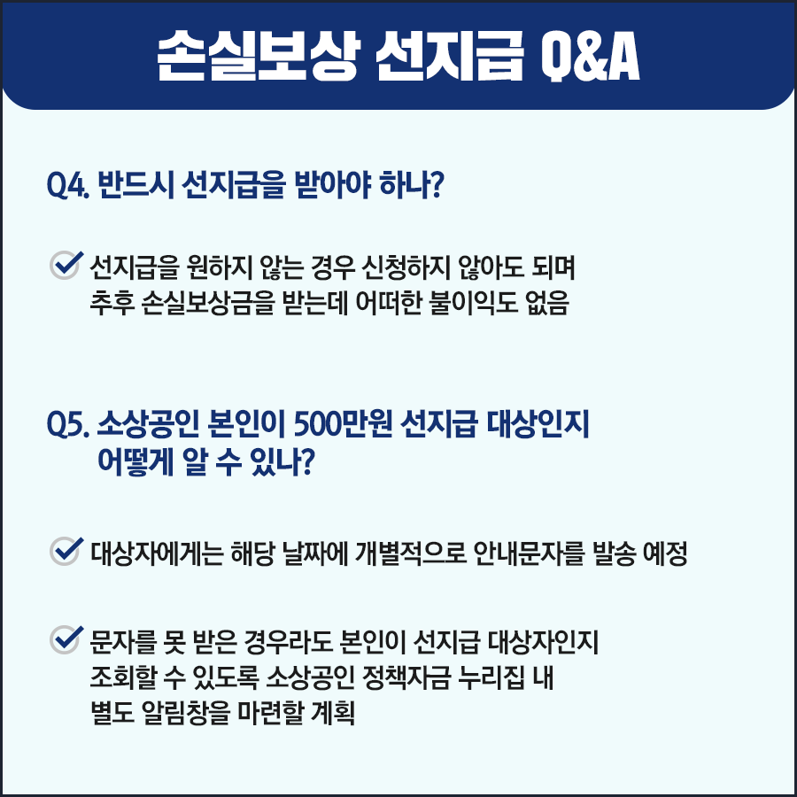 손실보상 선지급은 손실보상금이 긴급히 필요한 소상공인에게 적시에 전달될 수 있도록 일정 금액을 우선 지급하고 추후 확정되는 손실보상금으로 차감하는 새로운 손실보상 방식입니다.