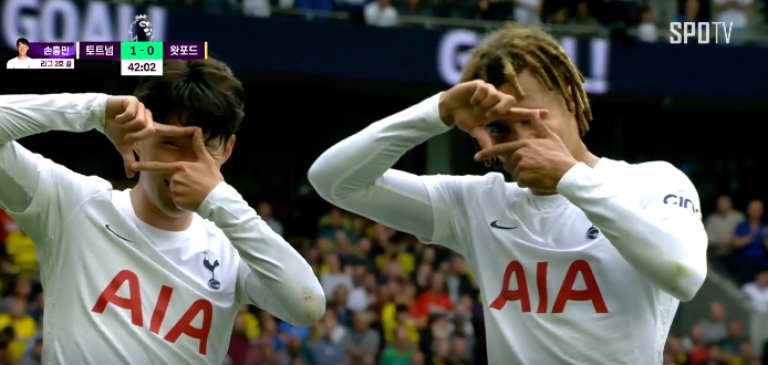 정말 환상적인 프리킥이며 골키퍼가 손 한번 못 쓰는 프리킥 득점이었습니다. 골이 골문으로 들어가면서 토트넘 홋스퍼 관중들은 손흥민의 득점에 열광하였고 손흥민은 동료 선수와 함께 찰칵 세리머니를 하였습니다.