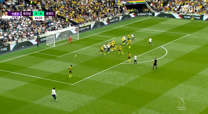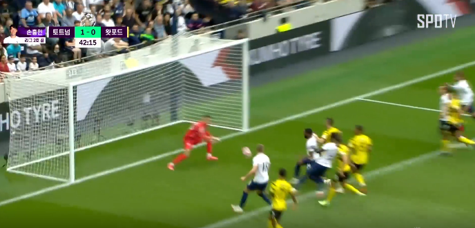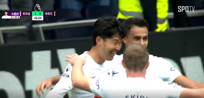 손흥민은 전반 40분에 왓포드 골문 왼쪽에서 황금 같은 프리킥 기회를 얻었습니다. 그리고 손흥민은 페널티박스 왼쪽에서 얻은 프리킥 기회를 놓치지 않고 오른발로 감아 찼습니다. 손흥민의 발을 떠한 공은 골문 바로 앞에서 원 바운드된 후 골문으로 빨려 들어갔습니다.