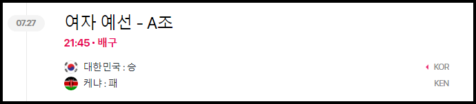 7월 27일 예선 2차전은 세계 랭킹 24위 케냐와 싸워 세트스코어 3대 0으로 브라질전에서 패배를 겪은 아픔을 씻어내며 올림픽에서 첫승을 거두었습니다.