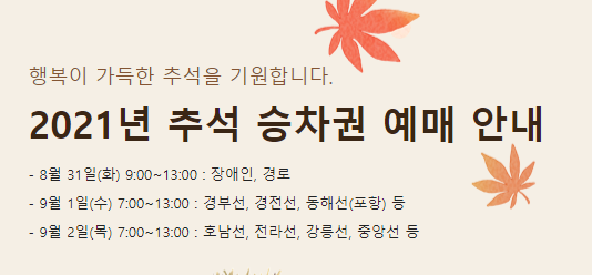 코레인 홈페이지에서 확인해 본 결과 추석 승차권 예매기간은 8월 31일 부터 9월 2일까지 이며 잔여석 판매는 9월 2일 오후 3시부터 가능하다고 합니다.
