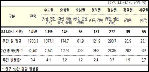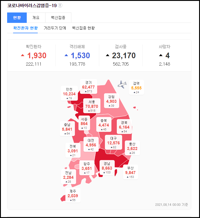 중앙 방역대책본부에 따르면 8월 14일 0시 기준으로 국내 발생 신규 확진자는 1,860명, 해외유입 사례는 70명이 확인돼 총 누적 확진자 수는 22만 2,111명(해외유입 1만 2,738명)입니다.