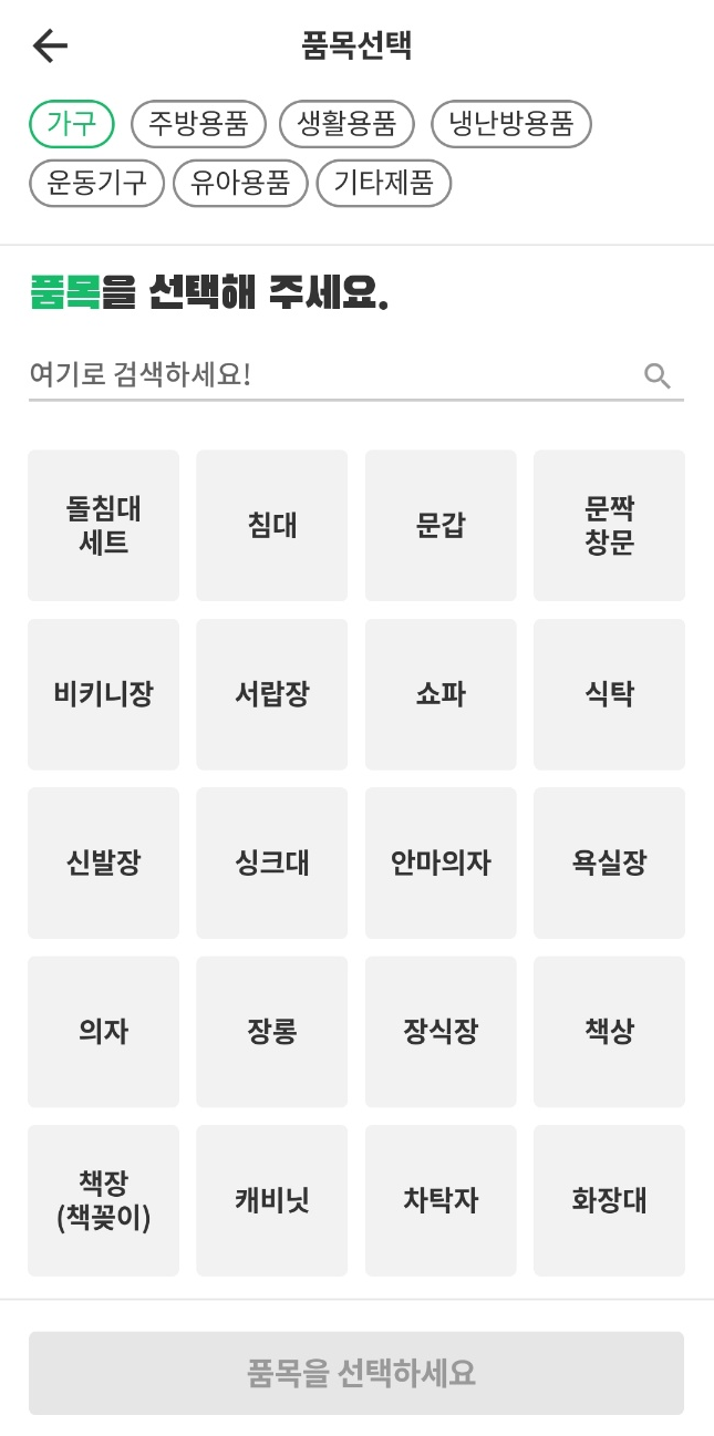▶ 여기로 의 첫화면입니다. 가구, 주방용품, 생활용품, 냉난방용품, 운동기구, 유아용품, 가전제품 등 기타 제품까지 버릴 수 있는 모든 제품을 수거해 갑니다. 이제 품목을 선택해 보겠습니다.