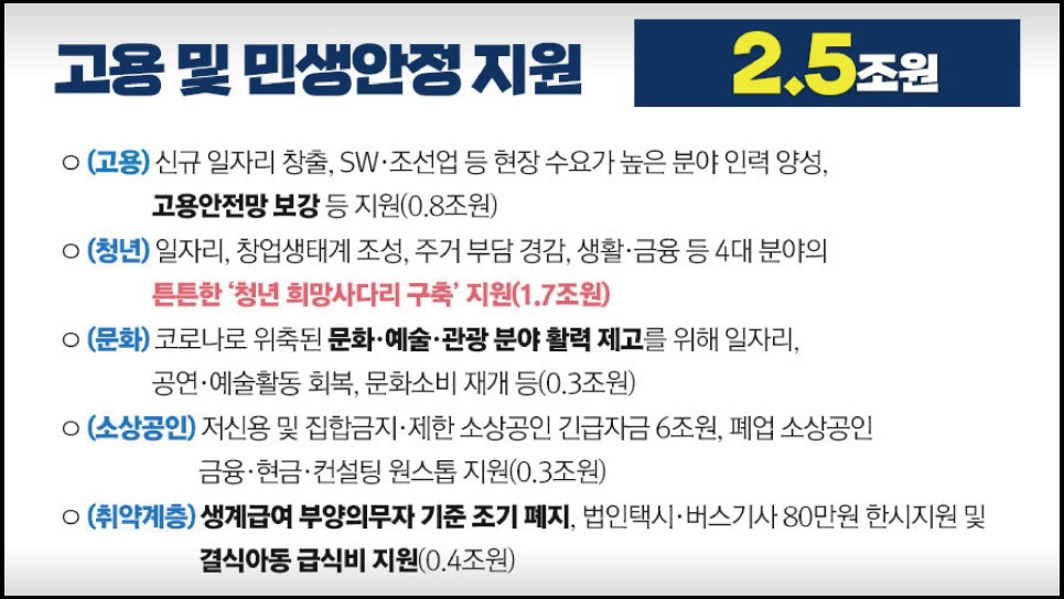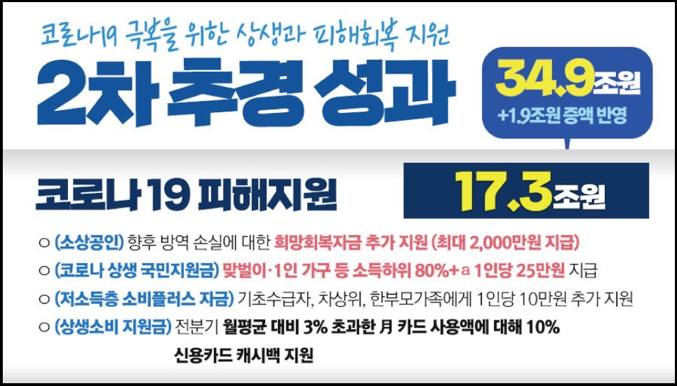 또한 소상공인을 대상으로 하는 희망회복자금 지원금도 최대 2천만 원 지급되며, 백신·방역 보강 및 고용, 민생안정지원 등 총 34조 9천억 원 규모의 추경안을 의결했습니다.