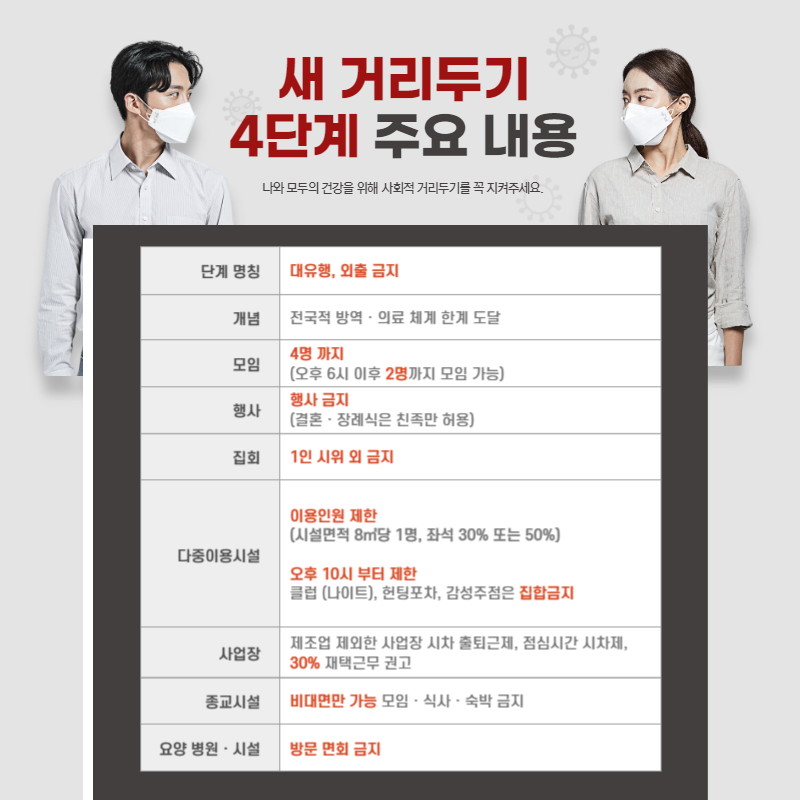 스포츠 영업시설 및 예방접종 완료자에 한시적으로 적용 중인 수칙을 정규화하여 4단계에서 사적모임의 예외를 인정하지 않습니다. (기존 임시 적용 조치)