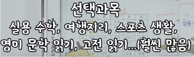 그리고 선택과목으로는 실용수학, 여행 지리, 스포츠 생활, 영미 문학 읽기, 고전 읽기 등 많은 과목들을 선택할 수 있습니다. 또한 창의적 체험 활동도 선택할 수 있습니다. 창의적 체험 활동 중에는 진로 탐구, 동아리, 자치활동 등이 있습니다.