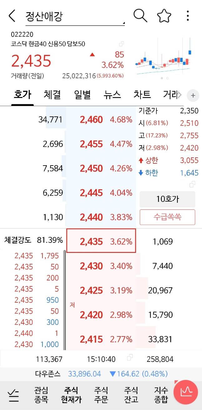 그중 정산 애강과 엠케이전자 엘컴텍이 5%에서 10% 사이 상승하였네요.