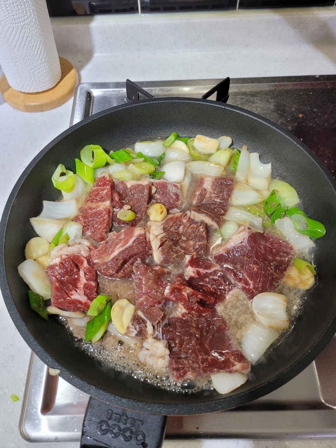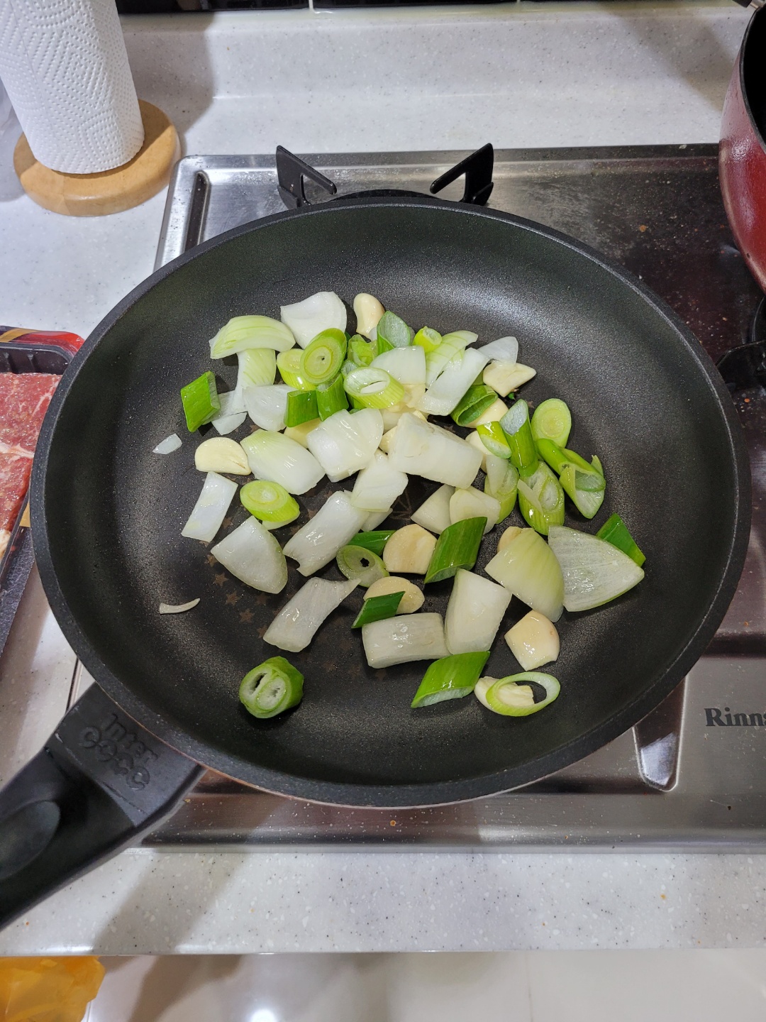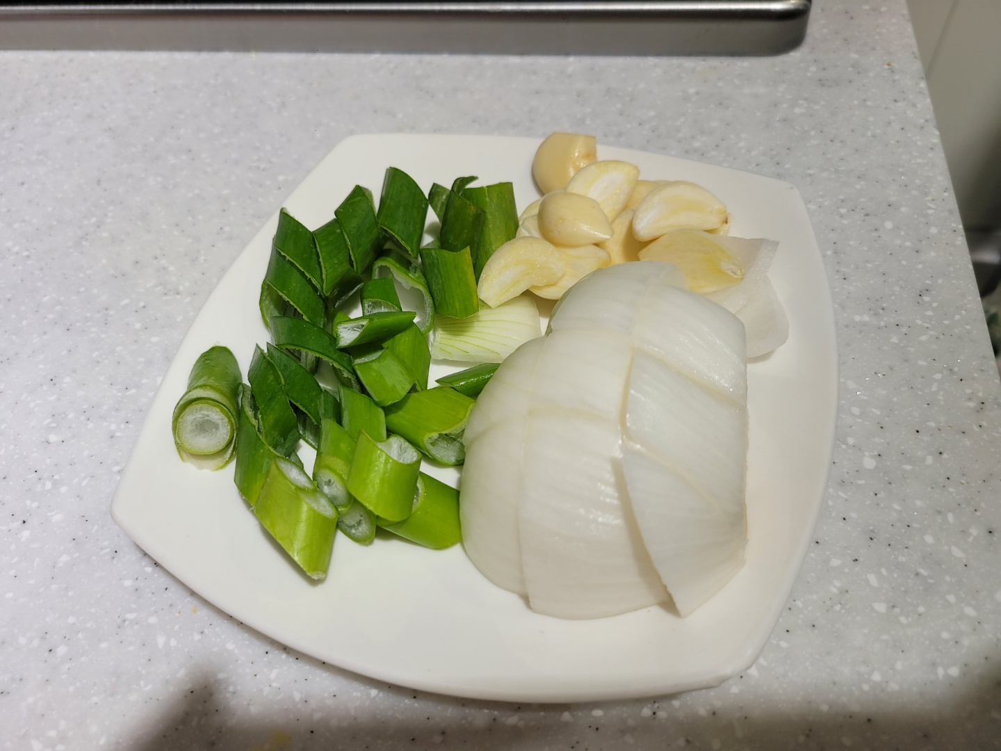 야채를 준비했다. 야채라고 해봤자 양파와 마늘, 파 밖에 없지만 나름 같이 들어가면 풍미까지는 아니라도 맛은 있다.