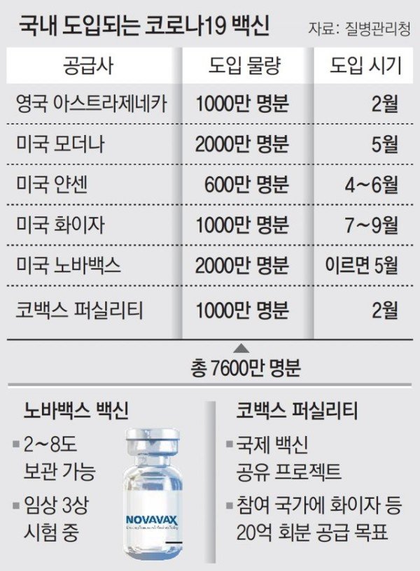 한국은 노바백스 백신 4000 만회분(2000만 명분)을 확보했으며 3분기 내 최대 2000 만회분을