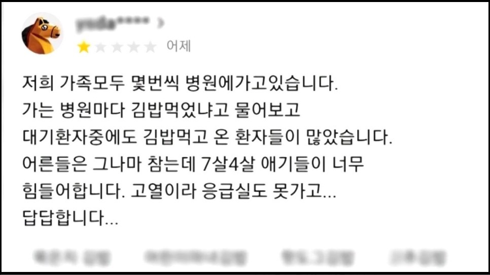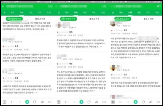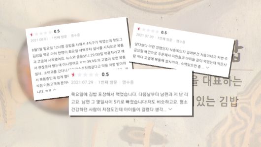 김밥 먹고 와이프랑 저랑 식중독 걸려 열이 40도까지 올라갔다는 리뷰와 초기 임 삼부인데 해당 기간 김밥을 먹고 다음날 고열과 복통, 설사, 근육통까지 아프고 고생했다며 위생 관리를 철저히 해주길 바란다는 리뷰 등 많은 리뷰글이 올라왔다고 합니다.