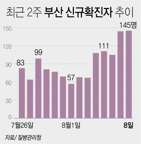 부산은 지난 4일 105명으로 다시 확진자의 수가 세 자리로 올라선 이후 5일 111명, 6일 100명을 기록했으며 급기야 7일에는 사상 최고치인 171명을 발생했습니다. 이에 부산은 거리두기 단계를 4단계로 격상하였습니다.
