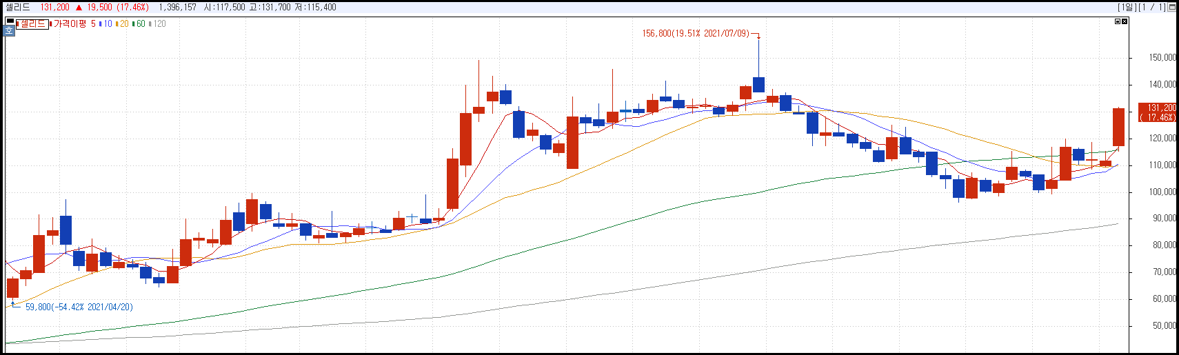 안녕하세요. 오늘 19일 5.19% 상승 출발한 주가는 꾸준히 올라 오전 10시 4분 현재 전일대비 14.15% 수준인 12만 7500원을 기록하고 있습니다. 차트를 보시면 단기간에 골든크로스를 만들고 주가가 60일선까지 뚫고 가는 모습입니다. 이에 오늘은 셀리드 주가상승의 이슈와 셀리드 주가전망에 대해 알아보겠습니다.
