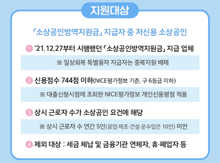 또한, 세금체납자, 금융기관 연체자, 휴업이나 폐업 중인 사람도 지원에서 제외됩니다.
