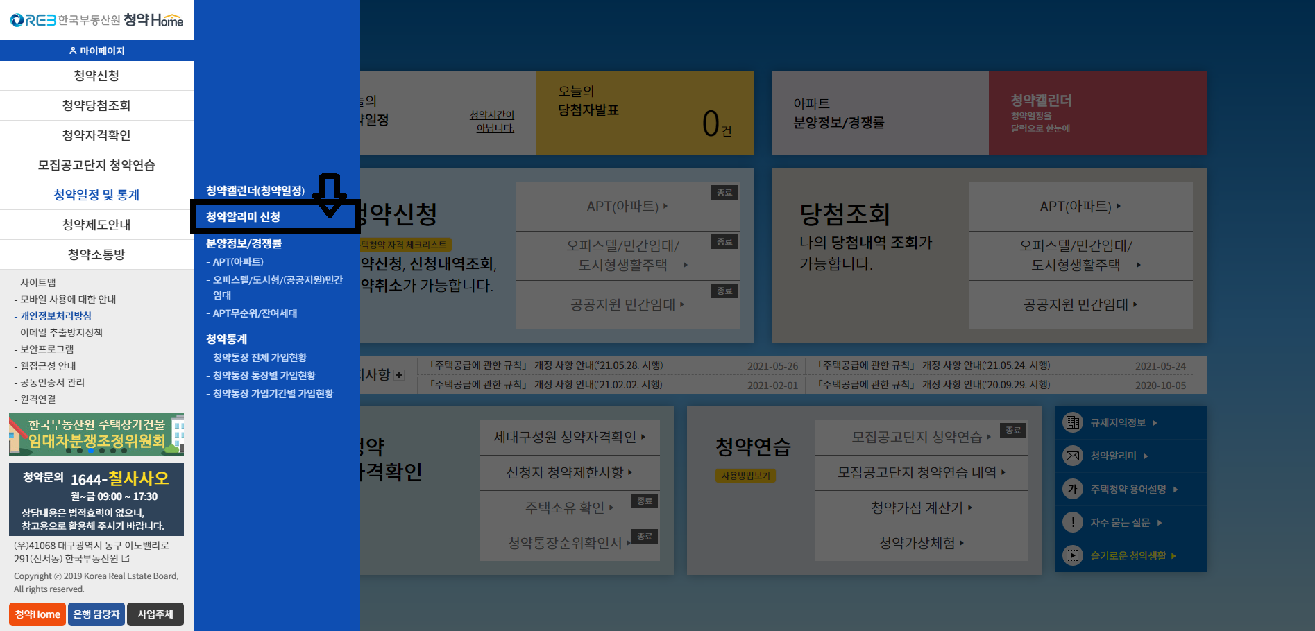2. 옆으로 나온 창에 두 번째에 있는 '청약 알리미 신청'을 클릭해주세요