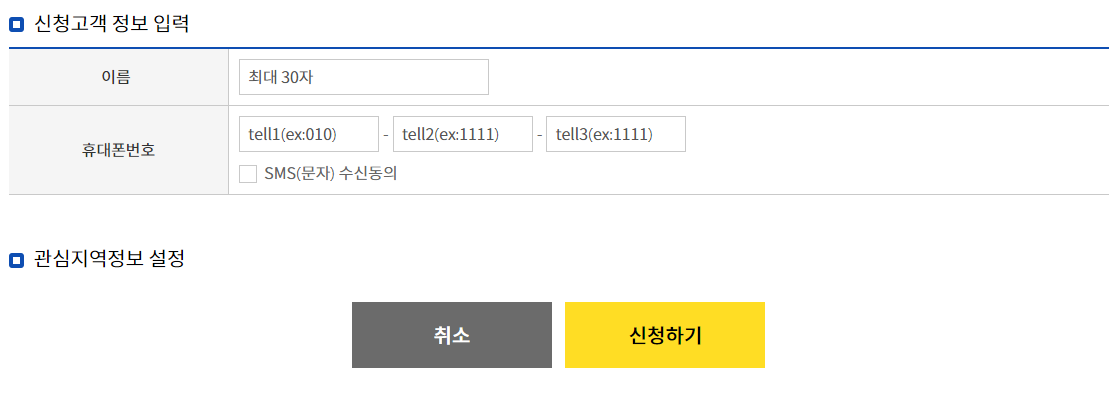 4. 신청 고객 정보 입력란에 이름 전화번호를 입력하시고 문자 수신동의에 체크해주시면 바로 인증번호 입력란이 나오게 됩니다. 그럼 인증번호를 입력해주세요.