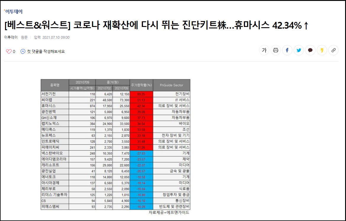 물론 코로나19 확진자가 줄었기 때문이라고 볼 수는 있지만 주식은 기대감에 상승하여 언론에 노출이 되면 기대감이라는 것이 사라지는 것 같습니다. 이제 월요일부터 수도권은 거리두기 4단계를 실행한다고 하고 비수도권은 현행 거리두기를 그대로 시행한다고 합니다. 지금 당장은 휴마시스의 주가는 계속 상승할 수 있다고 생각합니다. 하지만 장기적으로는 그렇게 많은 모멘텀을 가지고 있는 종목은 아니라고 생각합니다.